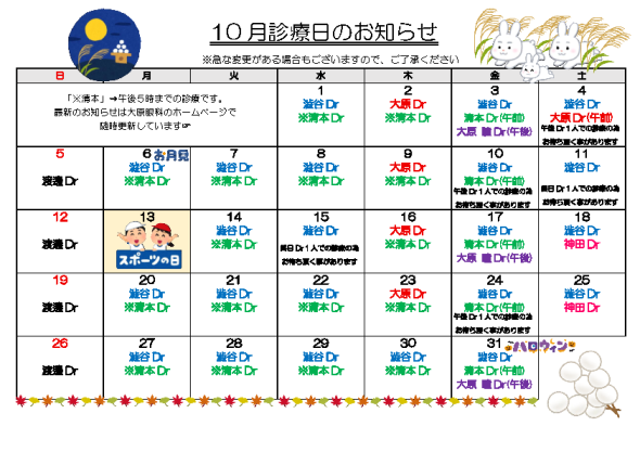 10月・11月 Drお休み・診療時間変更のお知らせ