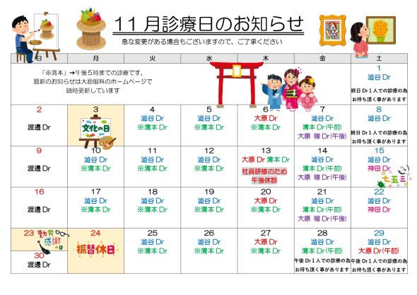 11月15日(土) 大原Dr休診 神田Dr診察(1日)