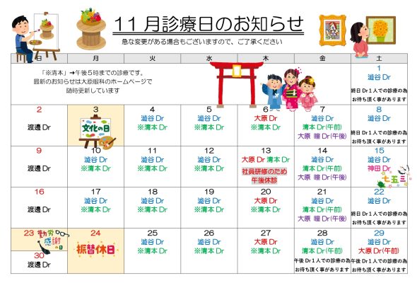 11月15日(土) 大原Dr休診 神田Dr診察(1日)