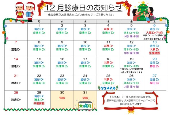 12月・1月 Drお休み・診療時間変更のお知らせ