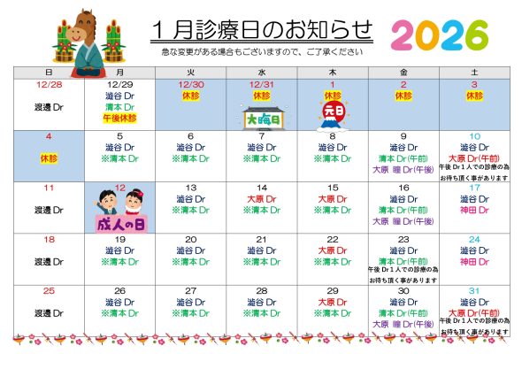 1月8日(木) 大原Dr休診 澁谷Dr代診