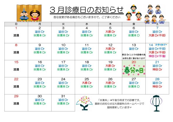 ※3月の金曜日は清本Drが午後5:00まで診療をされます
