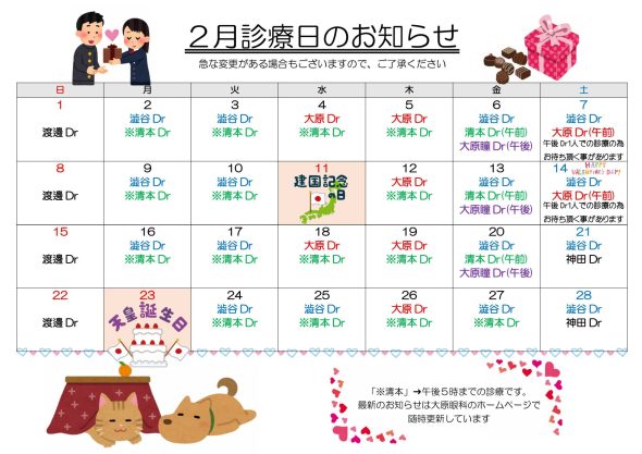 2月28日(土) 大原Dr休診 神田Dr診察(1日)